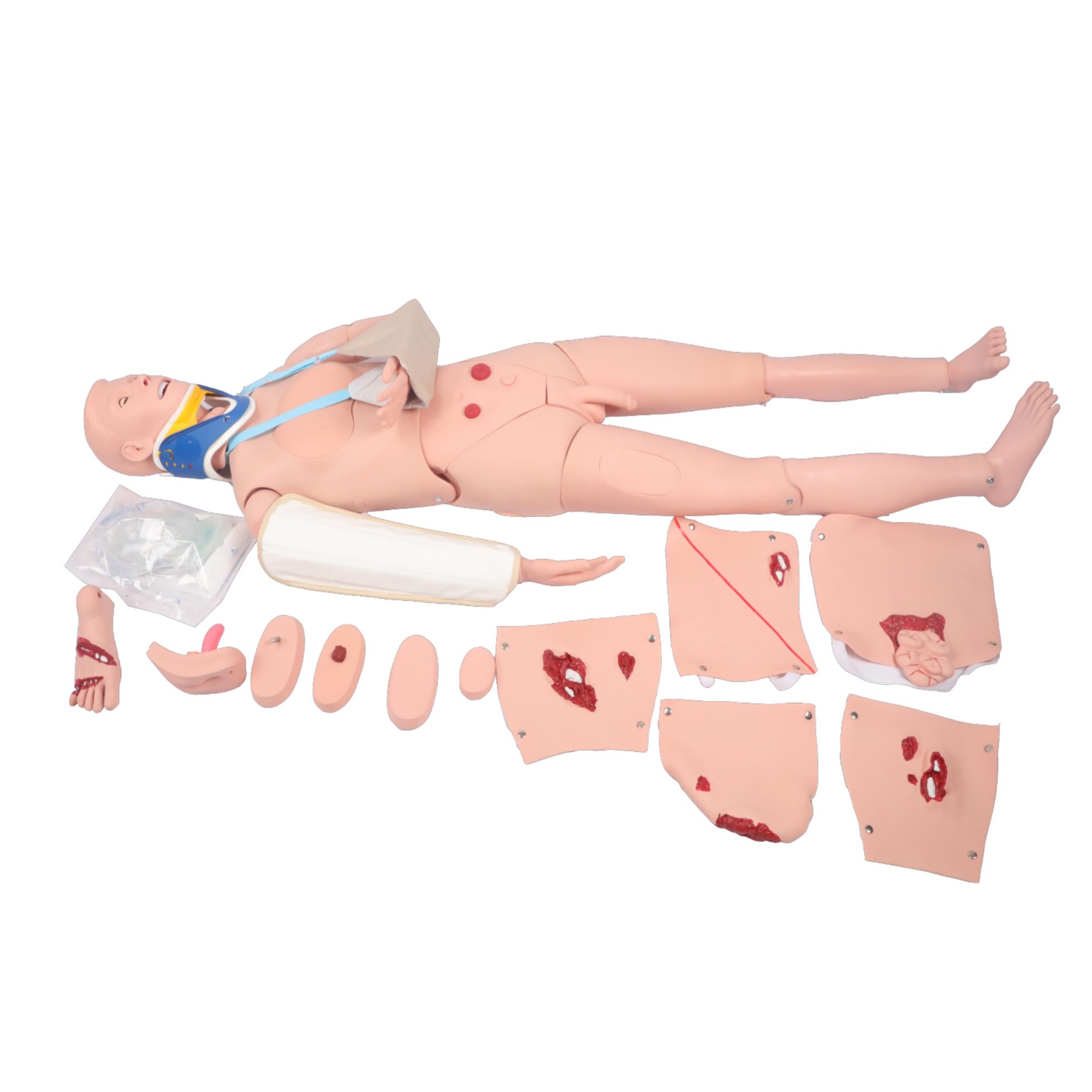 本產品是一款高端整體仿真護理人模型,適用于急救教學與實踐操作。模型可擺放成多種操作體位,具有高度仿真性。功能特點包括上肢肱骨上段和下肢脛腓骨下段的閉合性骨折模擬,用戶可觸及骨折斷端,體驗成角畸形和骨摩擦感。此外,模型兼容所有骨折支具,為醫護人員提供逼真的骨折處理訓練環境。