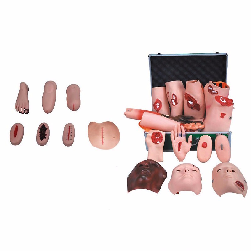 該創傷功能模塊涵蓋多種嚴重創傷情境:面部燒傷精細區分 Ⅰ、Ⅱ、Ⅲ 度,模擬不同程度損傷;頜骨創傷、鎖骨與胸膛挫傷、腹部創傷伴小腸突露等,全方位呈現軀干部位受傷狀況。四肢更是重點涉及,右上臂、右大腿、右小腿多處開放性骨折,還有右手、右足骨折及軟組織撕裂,甚至骨組織暴露、槍彈傷口等。此外,左肢同樣呈現燒傷、截斷創傷等,還包含胸壁、大腿的切開縫合傷口以及各類皮膚損傷、感染、壞疽,為創傷救治訓練提供豐富場景。