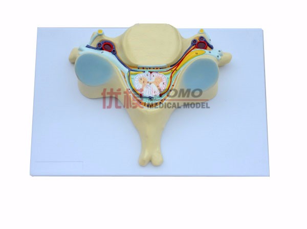 該模型顯示第五頸椎、椎動脈、椎靜脈與脊髓的橫切面以及脊神經組成、硬脊膜、蛛網膜下隙等結構。