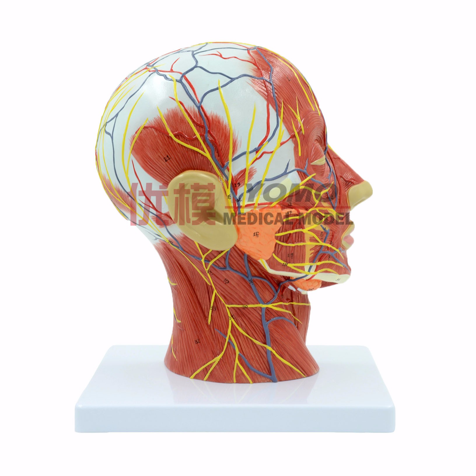 此模型為自然大頭頸淺表神經血管肌肉模型,1部件,顯示了人類右側頭頸部及正中矢切面的細節,包括暴露的臉部的淺表肌肉,臉部和頭皮的淺表血管、神經及腮腺和上呼吸道的內側結構及頸椎矢狀斷面結構。