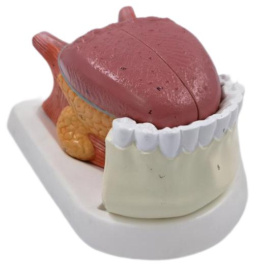 ■ 功能:此模型展示了下頜到第二臼齒,帶有中切的舌部。右半部是舌下腺和下頜下腺,可進一步仔細觀察;