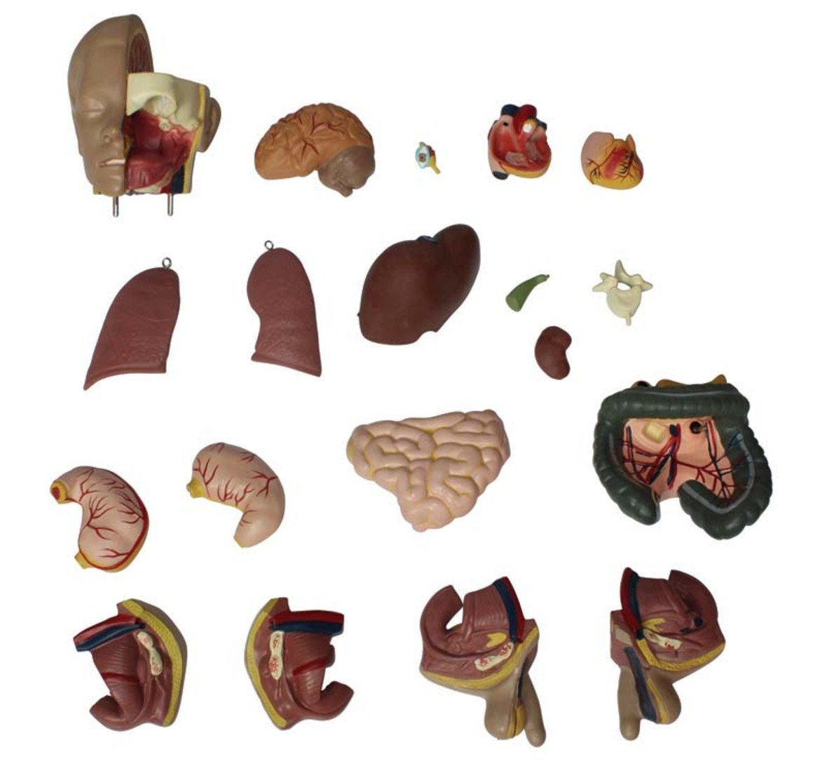 這個男女通用的軀干包括 20 個部分:軀干、頭部、眼球、大腦、肺(2 部分)、心臟(2 部分)、肝臟、膽囊、腎臟、胃(2 部分)、腸道(2 部分)、男性生殖器(2 部分)、女性生殖器(2 部分)和椎骨脊神經。