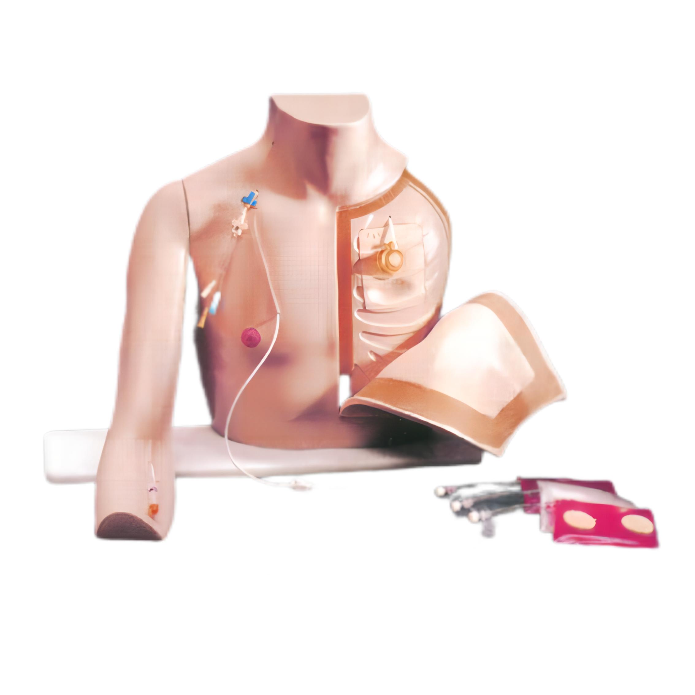 ▲高度模擬的上半身模型,帶有可分開的右手手臂,可進行插入、護理和取出,長時間的血管通道等模擬訓練。