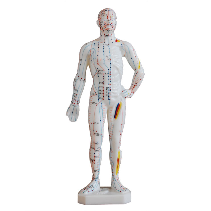 這款小型針灸模型顯示了14條經絡線和72個用漢字或數字標明的穴位。適合初級針灸治療課程使用。用軟PVC制成,尺寸:26CM高。