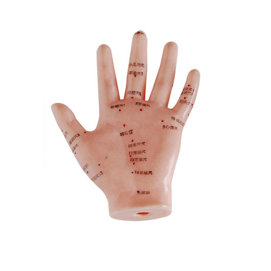 用軟而光亮的PVC制成的大規格的人手模型,顯示手背上的20個穴位和手心上13個穴位,穴位用漢字或數字標注。附中英文使用手冊。