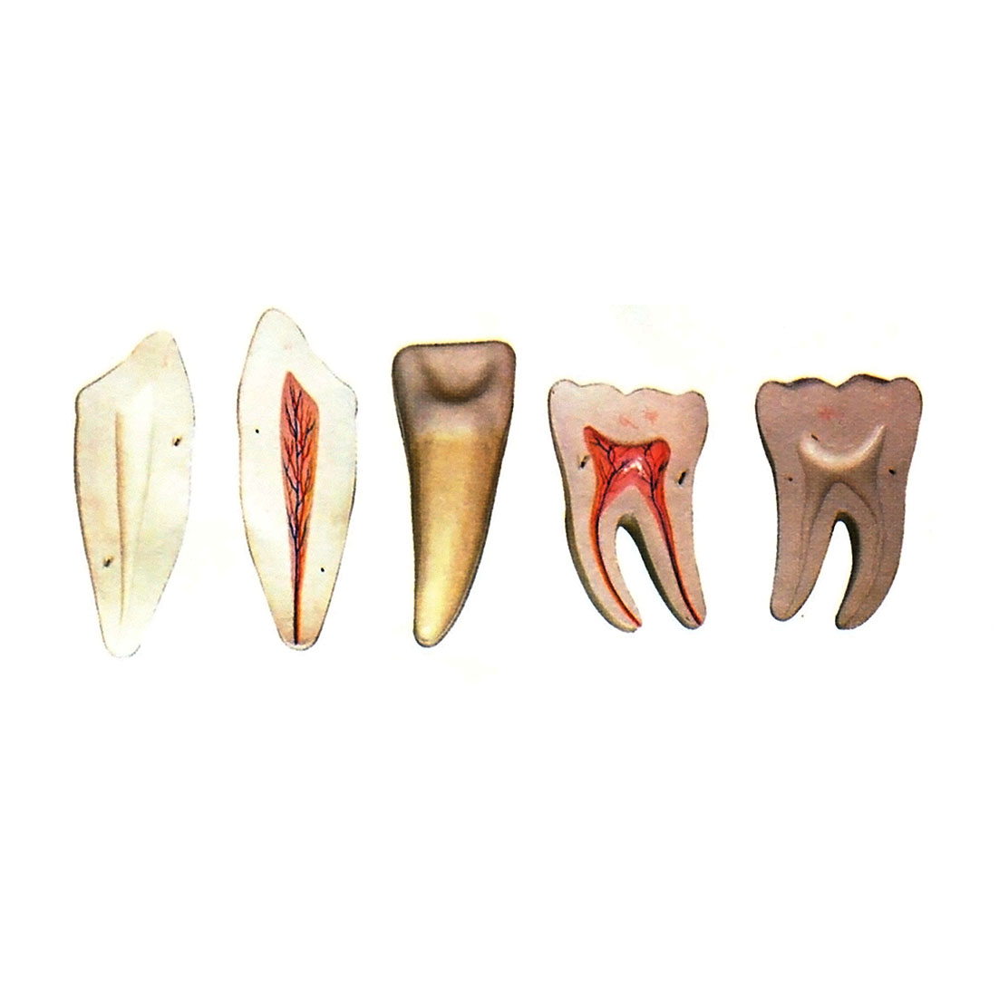 博友BM1098人齒放大模型示切牙及磨牙解剖。放大 牙齒可以分為切牙、尖牙、前磨牙和磨牙。一顆牙分為三個部分,牙冠、牙頸和牙根。牙冠部分有牙釉質, 質地堅硬的白色物質。牙釉質包圍著牙本質,接下來是神經和牙髓。在牙齒周圍的叫牙齦。