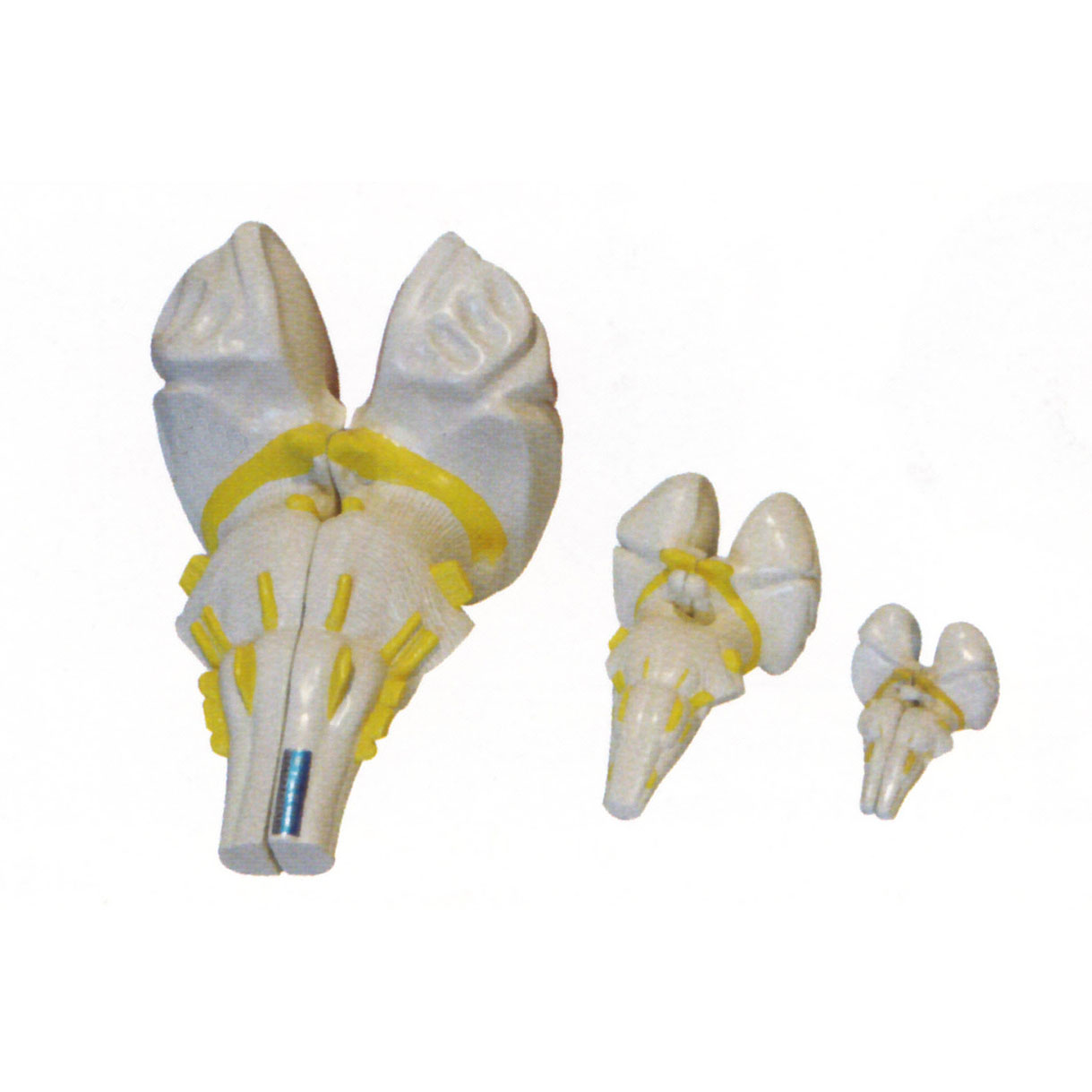 模型還顯示基底動脈,基底動脈由兩側椎動脈匯合而成。在橋腦底部通過時發出一些分支,穿入橋腦深部,供應橋腦的血循環。基底動脈有以下分支:旁正中動脈、圍繞橋腦的短旋動脈、小鬧上動脈和小腦下動脈。動脈分支分布。