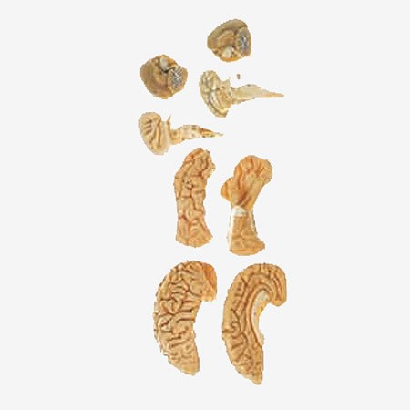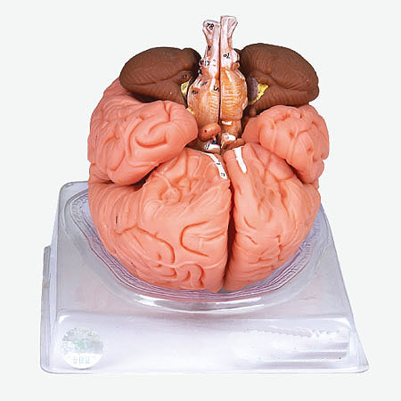 BM1124腦模型該模型由腦矢狀切面、大腦半球、小腦和腦干等8個部件組成,并顯示大腦半球、間腦、小腦和腦干中腦、腦橋、延髓各個部分,以及腦神經等結構,共有98個部位指示標志。