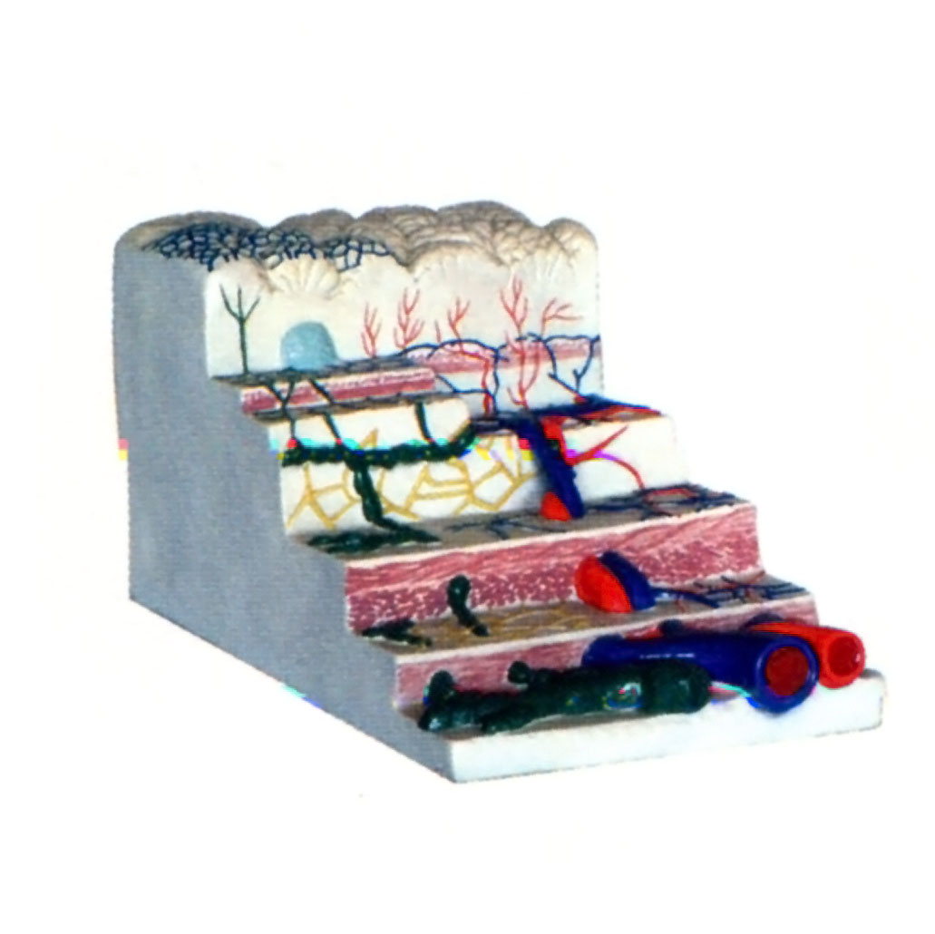 博友BM2016胃壁層次模型作階梯狀剝離,示各層結構及血管分布,主要顯示粘膜、粘膜下層、肌層和漿膜。 模型尺寸:27×10×15cm
