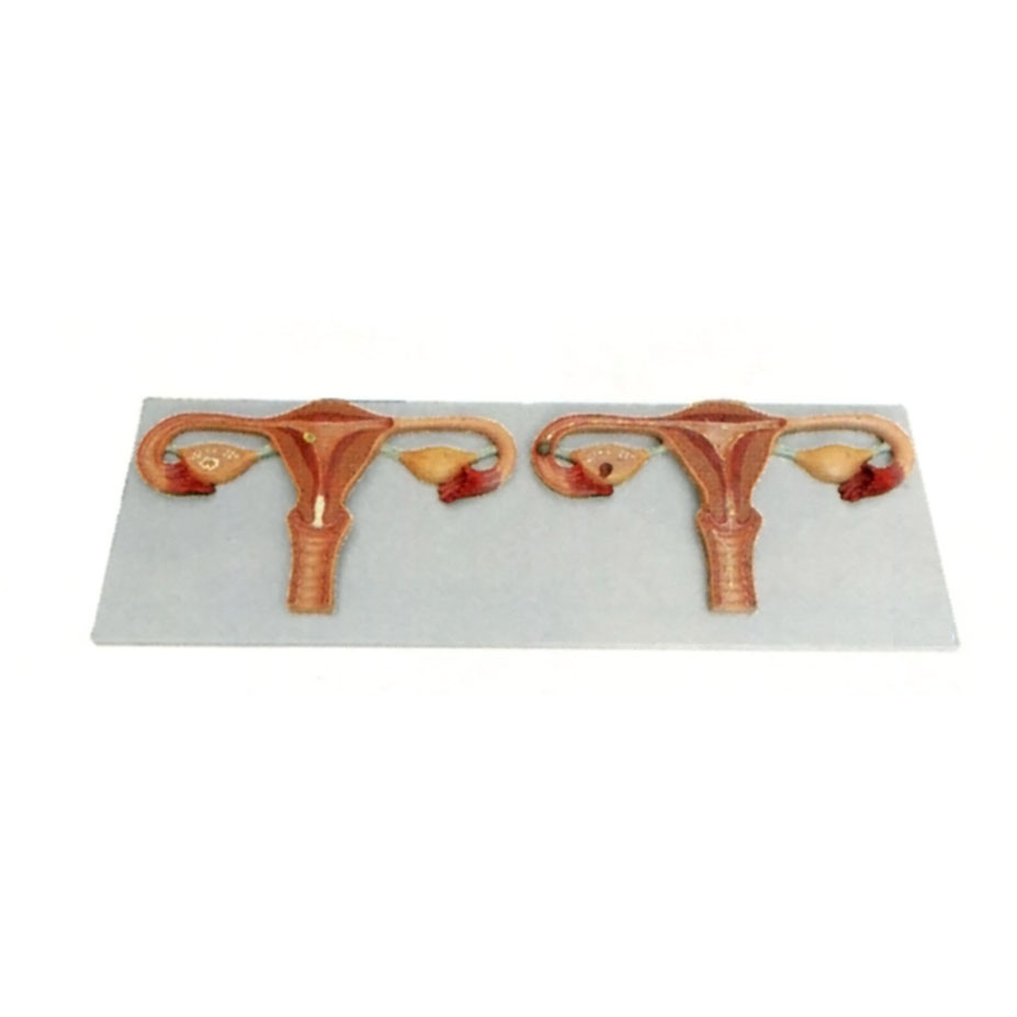 博友BM2076卵子受精過程放大模型由女性生殖器官冠狀切面(一個切面有精子進入,另一個切面有卵子受精后胚泡植入了宮內膜)的兩個部分組成,并顯示精子進入女性生殖器官,卵子與精子相遇受精后胚泡植入子宮內膜等結構,共有15個部位指示。