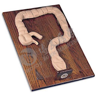 As the scope follows the contours of the large intestine, the student must negotiate the sigmoid colon, splenic flexure, and hepatic flexure before viewing the internal structure of the ascending colon and cecum. As the flexible sigmoidoscope is withdrawn, the student can identify benign sessile, pedunculated and hyperplastic polyps, as well as cancerous lesions. There are a total of 12 pathological conditions to diagnose. All manipulative and photographic techniques can also be practiced. Originally produced exclusively for ACMI, this simulator has been used for physician training nationwide. Life/form® Sigmoidoscopic Examination Simulator is available on a solid oak stand complete with lubricant, instruction guide, and hard carrying case. Three-year warranty. Size: 26" x 19" x 7".