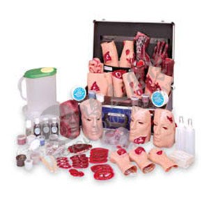 該95件套重創模型元件可進行創傷處理練習。這些用乙烯樹脂制成的傷口,可以粘貼或用繃帶綁在模型人或真實傷者的身體上。每個流血的傷口包括一個用于模擬血液的儲存袋和動力泵。用來練習快速識別傷口和傷口的伴隨癥狀、訓練現場急救、傷口分類。重15千克。