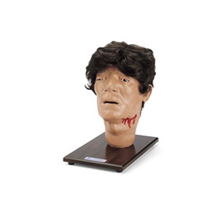 創傷頭部模型根據一名遇到交通意外的傷者塑造, 顯示不同的創傷情況,這個模型裝在底板上,但容易接到成人模型使用。